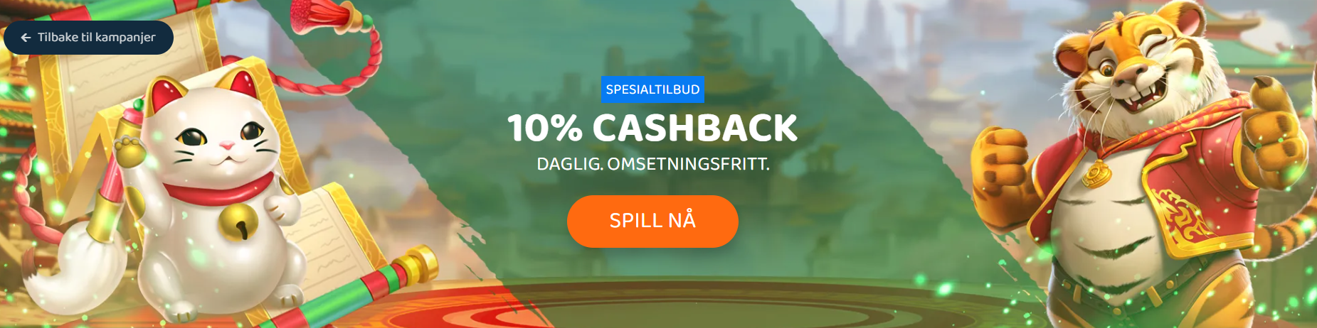 Cashbacken gis uten omsetningskrav og krediteres som ekte penger. Du står fritt til å ta ut beløpet eller spille videre. Dette gjør ordningen enkel og forutsigbar i praksis.